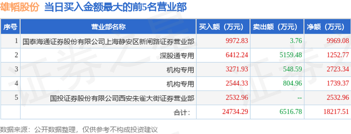 从龙虎榜公布的当日买卖数据来看,机构合计净买入4462.71万元,北向资金合计净买入1252.77万元。上海超短帮、朱雀大街等知名游资榜上有名。(知名游资上海超短帮一般指国泰海通证券股份有限公司上海静安区新闸路证券营业部席位、知名游资朱雀大街一般指国投证券股份有限公司西安朱雀大街证券营业部席位,根据市场资料整理,仅供参考)