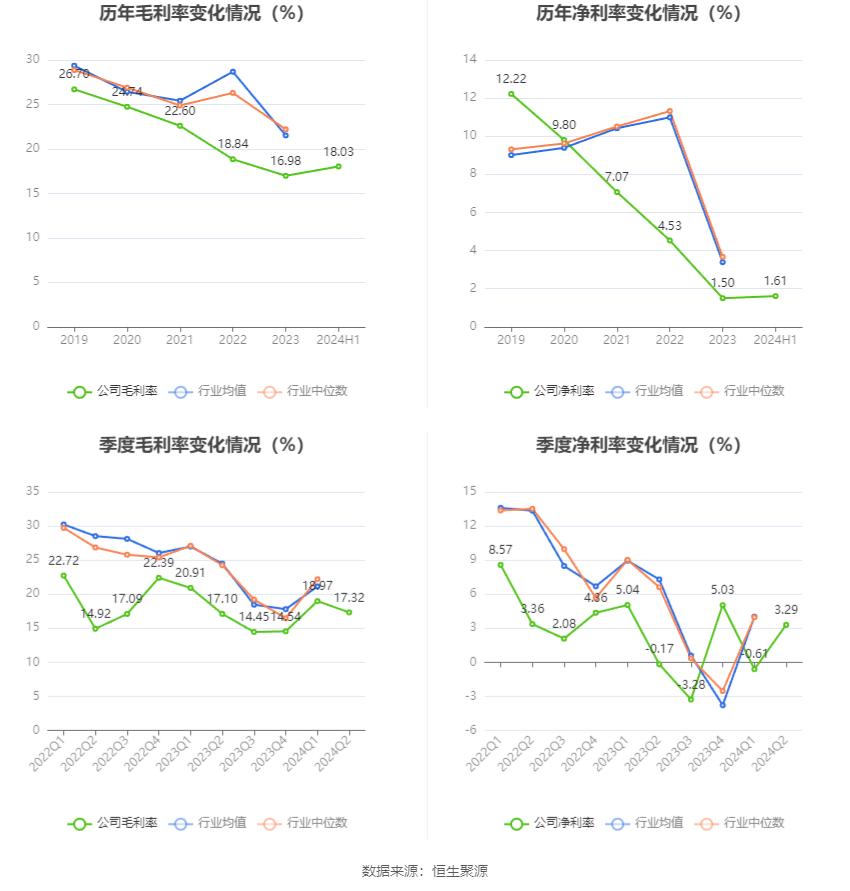 2024年上半年,公司毛利率为18.03%,同比下降1.02个百分点;净利率为1.61%,较上年同期下降0.89个百分点。从单季度指标来看,2024年第二季度公司毛利率为17.32%,同比上升0.22个百分点,环比下降1.65个百分点;净利率为3.29%,较上年同期上升3.46个百分点,较上一季度上升3.90个百分点。