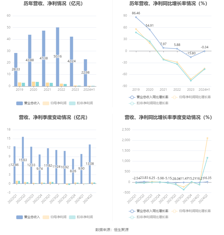 根据半年报,公司第二季度实现营业总收入13.08亿元,同比增长16.35%,环比增长32.10%;归母净利润4022.79万元,同比增长2099.22%,环比增长573.73%;扣非净利润3819.83万元,同比增长1164.90%,环比增长489.01%。