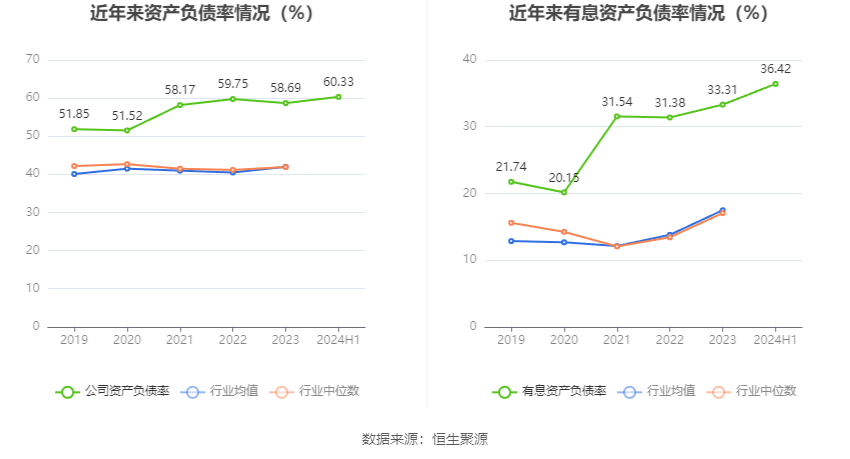 在偿债能力方面,公司2024年上半年末资产负债率为60.33%,相比上年末上升1.64个百分点;有息资产负债率为36.42%,相比上年末上升3.11个百分点。