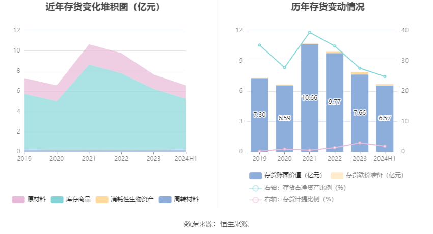 从存货变动来看,截至2024年上半年末,公司存货账面价值为6.57亿元,占净资产的24.89%,较上年末减少1.09亿元。其中,存货跌价准备为1256.59万元,计提比例为1.88%。