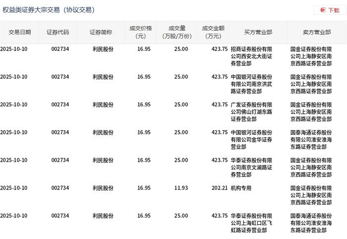 10月10日,利民股份大宗交易成交161.93万股,成交额2744.71万元,占当日总成交额的2.4%,成交价16.95元,较市场收盘价19.3元折价12.18%。