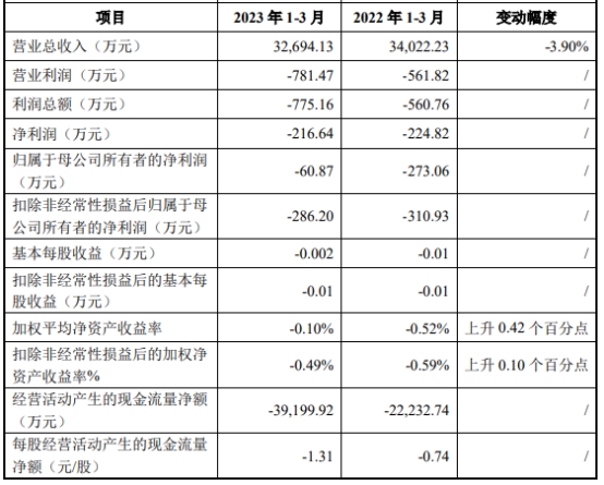2023年1-3月,公司实现营业总收入32,694.13万元,同比下降3.90%;净利润-216.64万元,上年同期为-224.82万元;归属于母公司所有者的净利润-60.87万元,上年同期为-273.06万元;扣除非经常性损益后归属于母公司所有者的净利润-286.20万元,上年同期为-310.93万元;经营活动产生的现金流量净额-39,199.92万元,上年同期为-22,232.74万元。