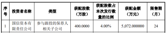 国信资本有限责任公司为参与跟投的保荐人相关子公司,获配400万股,获配股数占本次发行数量的4%,获配金额为5072万元,限售期为24个月。