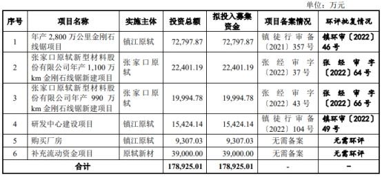 原轼新材原拟在深交所创业板发行股票数量不超过4,079.47万股,且同时不少于本次发行后股份总数的10%,原拟募集资金178,925.01万元,用于年产2,800万公里金刚石线锯项目、张家口原轼新型材料股份有限公司年产1,100万km 金刚石线锯新建项目、张家口原轼新型材料股份有限公司年产990万km 金刚石线锯新建项目、研发中心建设项目、购买厂房、补充流动资金项目。