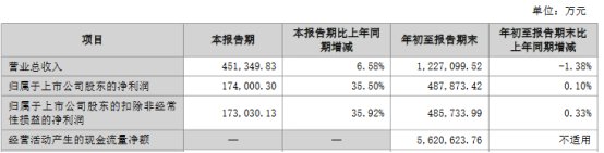 第三季度,公司实现营业收入45.13亿元,同比增长6.58%;归母净利润17.40亿元,同比增长35.50%;扣非净利润17.30亿元,同比增长35.92%。