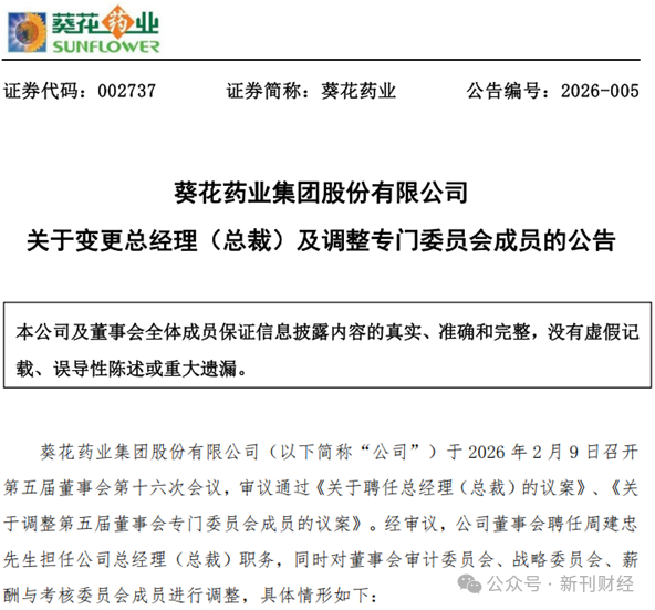 2月9日,葵花药业集团股份有限公司(002737.SZ,以下简称“葵花药业”)发布公告称,董事会于近日收到董事、总经理(总裁)关一女士提交的书面辞职报告。因个人原因,关一申请辞去公司总经理职务,仅保留董事及控股子公司相关职务。接任者是拥有丰富职业经理人履历、且长期在葵花集团内部担任要职的周建忠。