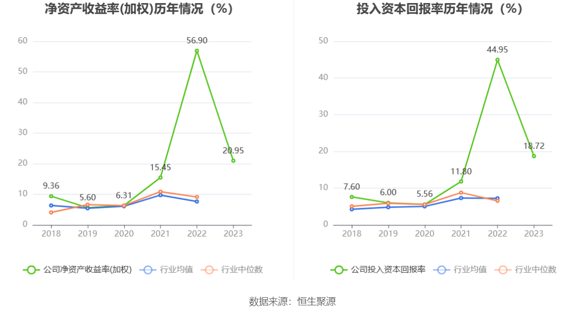 数据显示,2023年公司加权平均净资产收益率为20.95%,较上年同期下降35.95个百分点;公司2023年投入资本回报率为18.72%,较上年同期下降26.23个百分点。