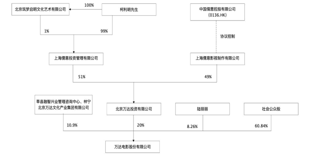 本次交易后,公司控股股东仍为万达投资,儒意投资持有万达投资 51%股权。儒意投资为柯利明全资控股的公司,柯利明通过儒意投资间接控制万达电影20%股权,公司实际控制人将变更为柯利明。此外,中国儒意通过协议控制的儒意影视持有万达投资 49%股权,柯利明亦持有中国儒意总股本 16.34%的股份。变更后万达电影股权控制关系如下: