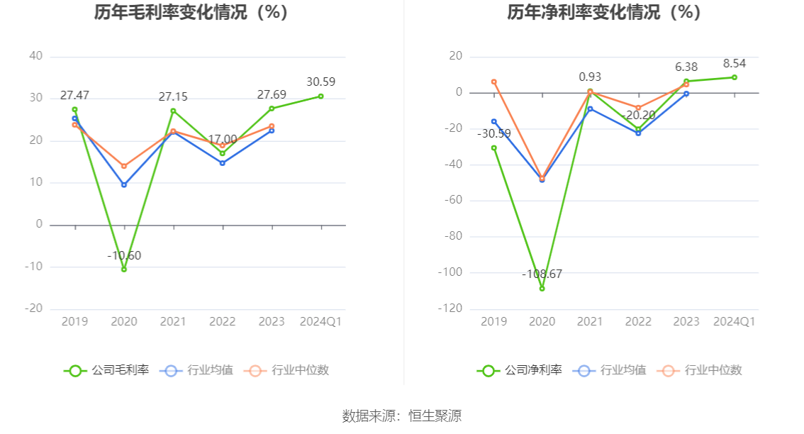 2024年第一季度,公司毛利率为30.59%,同比下降0.09个百分点;净利率为8.54%,较上年同期上升0.10个百分点。