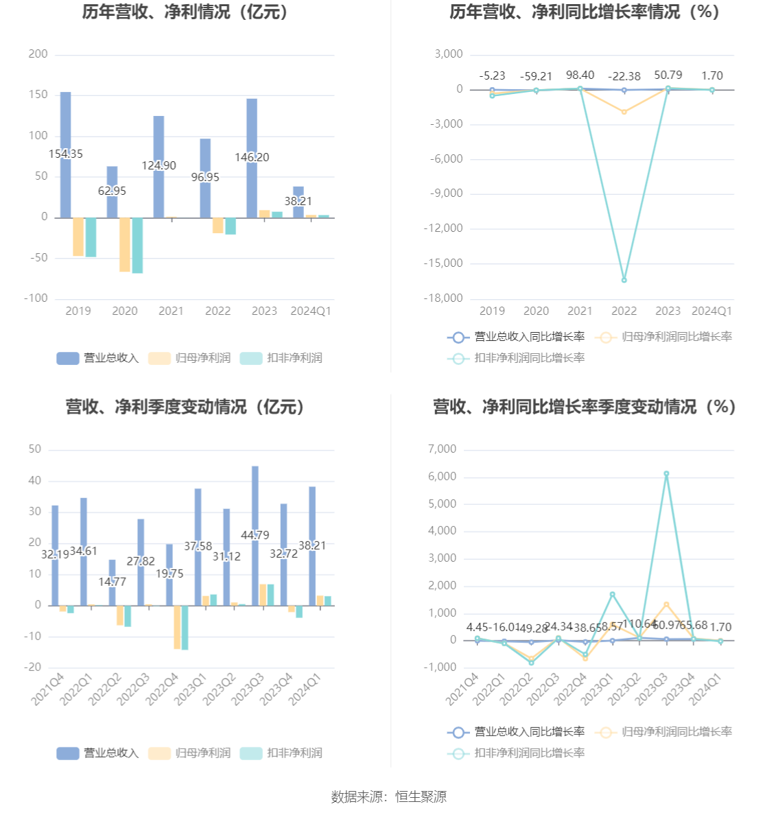 截至2024年一季度末,公司经营活动现金流净额为-4564.25万元,同比减少16.37亿元;筹资活动现金流净额-11.8亿元,同比减少5.82亿元;投资活动现金流净额-1.3亿元,上年同期为-1.59亿元。