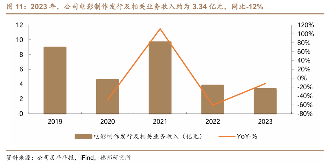 2023年,公司电影制作发行及相关业务收入约为3.34亿元,同比-12%。公司主投主控影片5部,其中《三大队》取得票房7亿元;《想见你》跨年上映取得票房4亿元,海外发行也实现较好的收入。此外,参与投资的《流浪地球2》《孤注一掷》《热烈》《前任4》等多部电影获得票房口碑双丰收。