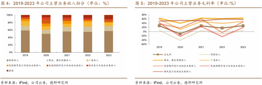 院线影院为公司的核心业务,观影、商品餐饮销售及广告收入合计占公司总营业收入约为80%。2023年观影收入达84.4亿元,同比增长56.89%,主要得益23年院线影院恢复正常经营;广告服务收入/商品餐饮销售收入分别为13.24/19.44亿元,分别同比增长8.35%/39.60%。