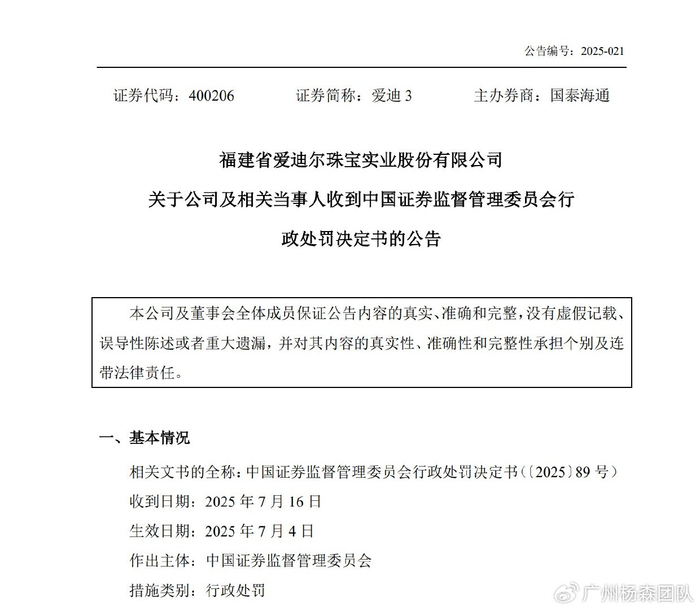 2025年7月17日,福建省爱迪尔珠宝实业股份有限公司(公司或者爱迪尔)披露,收到行政处罚决定书。