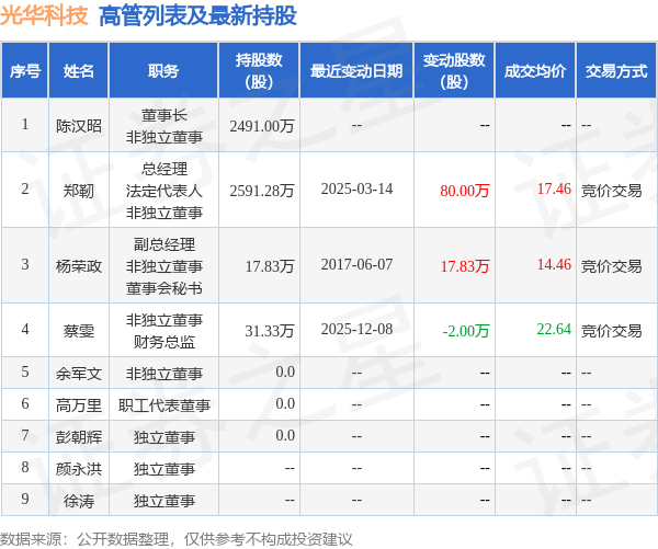 光华科技近半年内的董监高及核心技术人员增减持详情如下: