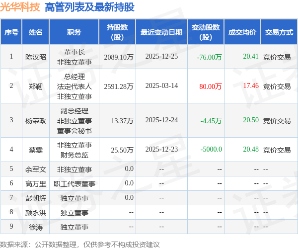 光华科技的高管列表及最新持股情况如下: