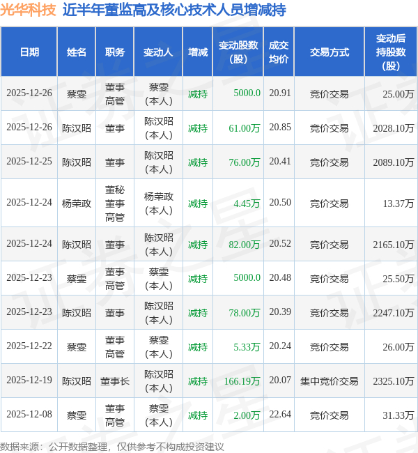 光华科技:12月26日高管陈汉昭、蔡雯减持股份合计61.5万股