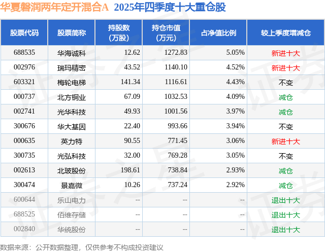 根据2025基金年报公募基金重仓股数据,重仓该股的公募基金共2家,其中持有数量最多的公募基金为华夏基金的华夏磐润两年定开混合A。华夏磐润两年定开混合A目前规模为1.78亿元,最新净值1.4183(3月18日),较上一交易日上涨2.03%,近一年上涨27.68%。该公募基金现任基金经理为张城源。张城源在任的基金产品包括:华夏磐泰混合(LOF)A,管理时间为2016年12月26日至今,期间收益率为83.5%;华夏磐利一年定开混合A,管理时间为2020年7月29日至今,期间收益率为96.53%;华夏磐锐一年定开混合A,管理时间为2020年12月22日至今,期间收益率为90.75%;华夏磐益一年定开混合,管理时间为2021年1月26日至今,期间收益率为60.35%。