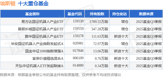 根据2025基金Q3季报公募基金重仓股数据,重仓该股的公募基金共7家,其中持有数量最多的公募基金为易方达基金的易方达国证机器人产业ETF。易方达国证机器人产业ETF目前规模为133.15亿元,最新净值1.6472(1月9日),较上一交易日上涨1.83%,近一年上涨45.71%。该公募基金现任基金经理为李栩 李树建。李栩在任的基金产品包括:易方达中证港股通互联网ETF,管理时间为2023年5月31日至今,期间收益率为44.51%;易方达中证2000ETF,管理时间为2023年9月13日至今,期间收益率为65.76%;易方达中证生物科技主题ETF发起式联接A,管理时间为2023年9月19日至今,期间收益率为2.4%;易方达国证信息技术创新主题ETF,管理时间为2023年9月20日至今,期间收益率为71.69%。李树建在任的基金产品包括:易方达创业板中盘200ETF,管理时间为2023年12月15日至今,期间收益率为58.7%;易方达上证科创板成长ETF联接发起式A,管理时间为2024年1月4日至今,期间收益率为134.11%;易方达信创ETF联接A,管理时间为2024年1月5日至今,期间收益率为94.22%;易方达机器人ETF联接A,管理时间为2024年5月21日至今,期间收益率为59.28%。