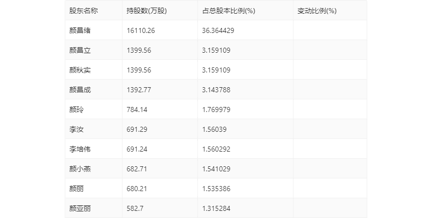 一季报显示,2024年一季度末公司十大流通股东中,持股最多的为颜昌绪,占比36.36%。十大流通股东名单相比2023年年报维持不变。在具体持股比例上,颜昌绪、颜昌立、颜秋实、颜昌成、颜玲、李汝、李培伟、颜小燕、颜丽、颜亚丽持股有所下降。