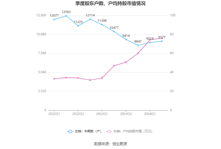 筹码集中度方面,截至2024年上半年末,公司股东总户数为9177户,较一季度末增长了158户,增幅1.75%;户均持股市值由一季度末的74.47万元上升至76.19万元,增幅为2.31%。