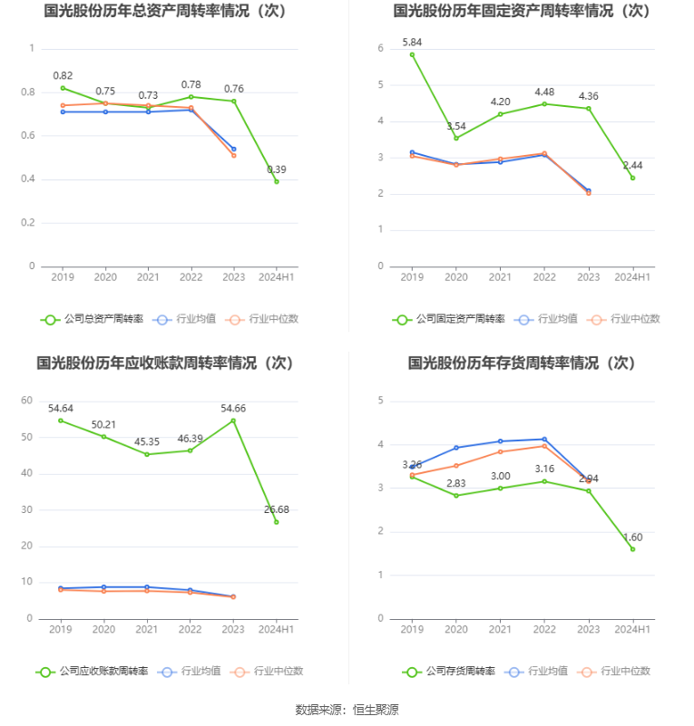 营运能力方面,2024年上半年,公司公司总资产周转率为0.39次,上年同期为0.40次(2023年上半年行业平均值为0.30次,公司位居同行业7/32);固定资产周转率为2.44次,上年同期为2.30次(2023年上半年行业平均值为1.23次,公司位居同行业6/32);公司应收账款周转率、存货周转率分别为26.68次、1.60次。
