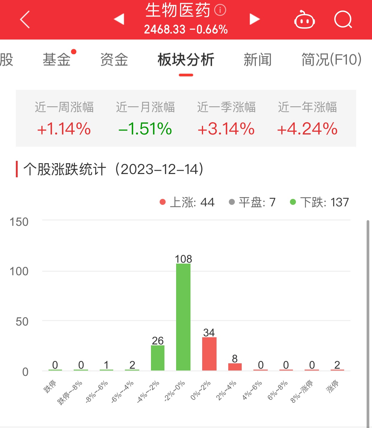 中国经济网北京12月14日讯今日,生物医药板块整体涨幅-0.66%,其中44只股票上涨,7只股票平盘,137只股票下跌。