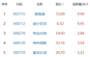 其中,奥赛康、南宁百货、特宝生物、神州细胞、康龙化成位列板块涨幅前五位,涨幅分别为9.99%、9.95%、3.84%、3.54%、3.23%。