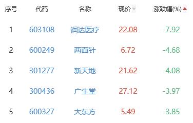 润达医疗、两面针、新天地、广生堂、大东方位列涨幅榜后五位,涨幅分别为-7.92%、-4.68%、-4.08%、-3.97%、-3.85%。