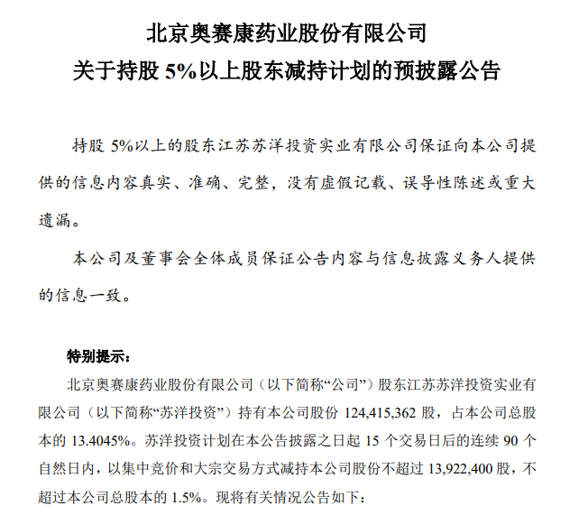 7月30日,奥赛康(002755)公告称,股东江苏苏洋投资实业有限公司计划在本公告披露之日起15个交易日后的连续90个自然日内,以集中竞价和大宗交易方式减持本公司股份不超过13,922,400股,不超过本公司总股本的1.5%。