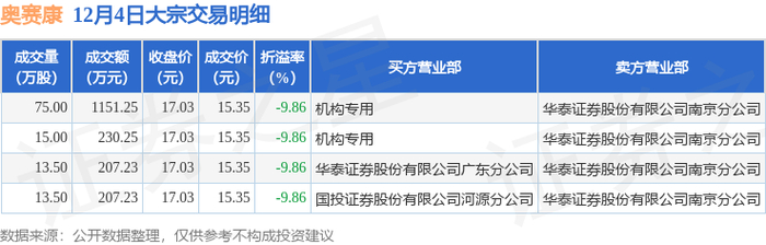 证券之星消息,12月4日奥赛康发生大宗交易,交易数据如下: