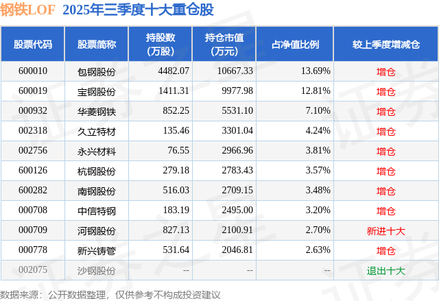 根据2025基金Q3季报公募基金重仓股数据,重仓该股的公募基金共12家,其中持有数量最多的公募基金为鹏华基金的钢铁LOF。钢铁LOF目前规模为4.04亿元,最新净值1.8435(12月25日),较上一交易日上涨0.34%,近一年上涨24.33%。该公募基金现任基金经理为闫冬。闫冬在任的基金产品包括:鹏华中证800地产指数(LOF)A,管理时间为2019年4月30日至今,期间收益率为-41.1%;鹏华中证A股资源产业指数(LOF)A,管理时间为2019年11月20日至今,期间收益率为168.9%;鹏华中证光伏产业ETF,管理时间为2021年2月22日至今,期间收益率为-4.41%;鹏华中证细分化工产业ETF,管理时间为2021年2月23日至今,期间收益率为-20.42%。