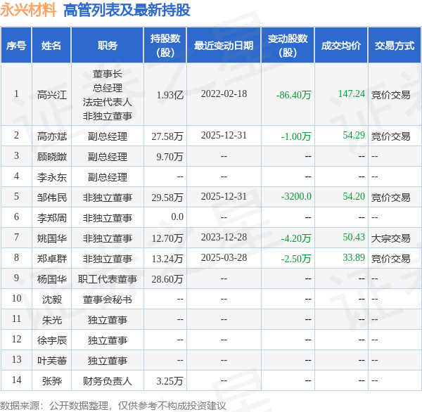 永兴材料:12月31日高管高亦斌、邹伟民减持股份合计1.32万股