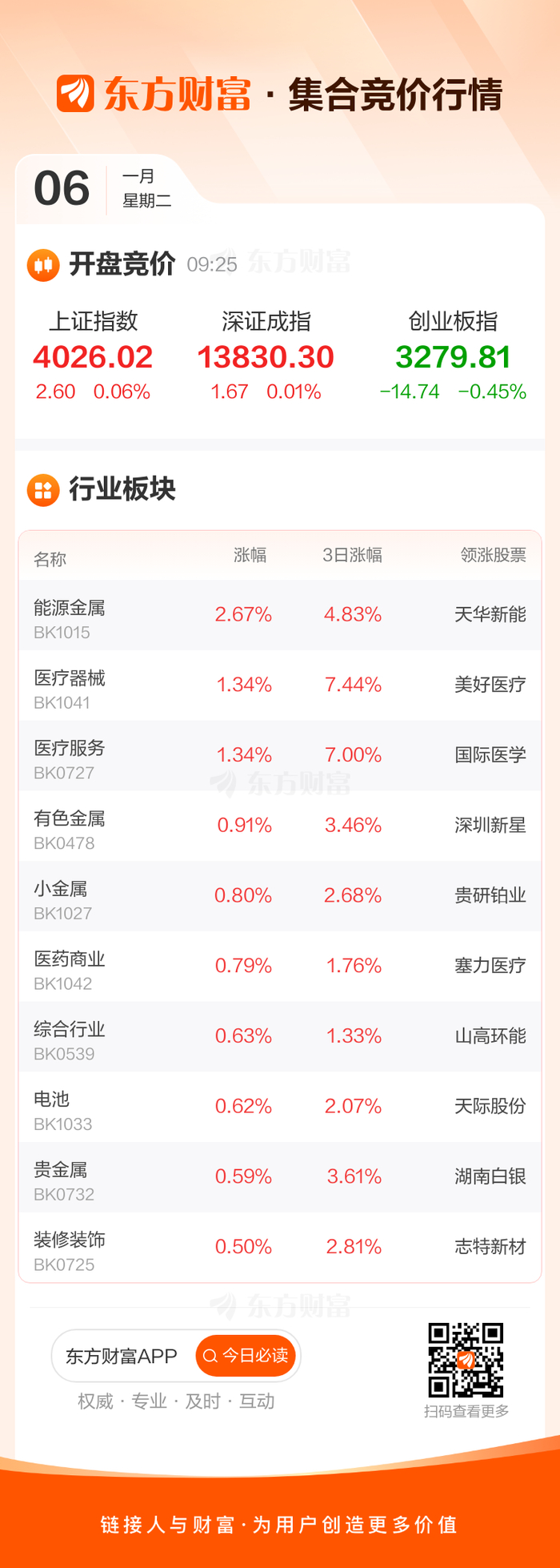 1月6日,三大指数开盘涨跌互现,上证指数高开0.06%,深证成指高开0.01%,创业板指低开0.45%。板块方面,能源金属领涨,天华新能涨4.73%,医疗器械、医疗服务等开盘涨幅居前。