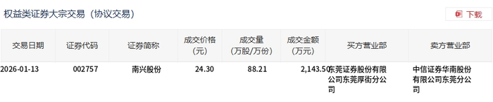 1月13日,南兴股份大宗交易成交88.21万股,成交额2143.5万元,占当日总成交额的0.91%,成交价24.3元,较市场收盘价25.01元折价2.84%。