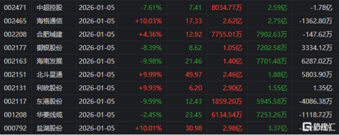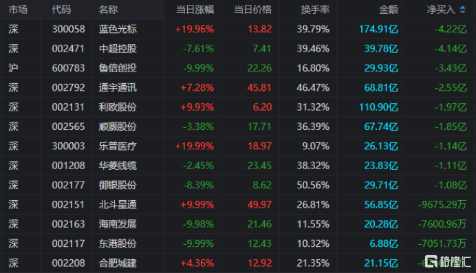 龙虎榜单日净卖出额前三为蓝色光标、中超控股、鲁信创投,分别为4.22亿、4.14亿、3.43亿。