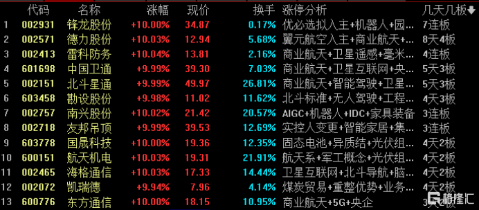 锋龙股份7连板,德力股份8天4板,雷科防务4连板,中国卫通、北斗星通5天3板,勘设股份4天3板,南兴股份、友邦吊顶3连板,国晟科技、航天机电、海格通信、凯瑞德4天2板,东方通信3天2板。