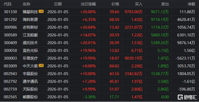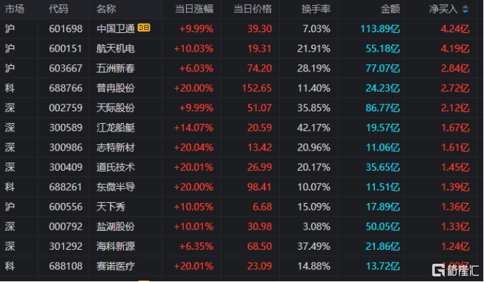 龙虎榜单日净买入额前三为航天机电、五洲新春、普冉股份,分别为4.19亿、2.84亿、2.72亿。