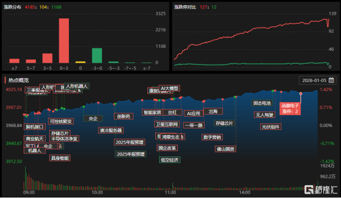 1月5日,沪指12连阳重回4000点。截至收盘,沪指涨1.38%,深证成指涨2.24%,创业板指涨2.85%。