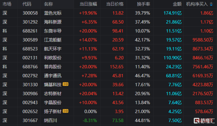 龙虎榜中涉及机构专用席位的个股中,单日净买入额前三为蓝色光标、海科新源、东微半导,分别为1.86亿、1.17亿、1.10亿。