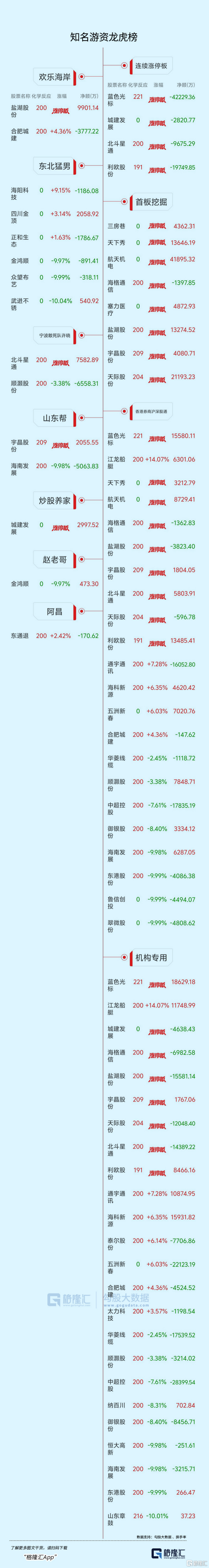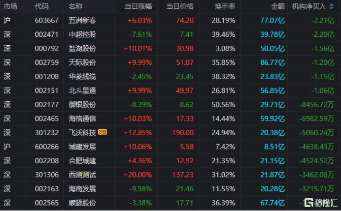 龙虎榜中涉及机构专用席位的个股中,单日净卖出额前三为五洲新春、中超控股、盐湖股份,分别为2.21亿、2.20亿、1.56亿。