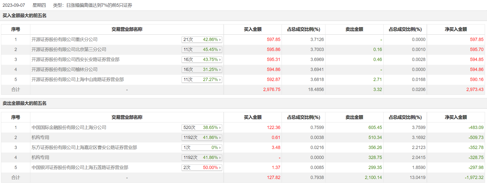 具体来看,机构买入6076元,卖出839.09万元,合计净卖出838.48万元。此外,开源证券重庆分公司、开源证券北京第三分公司分别买入597.85万元、595.86万元;中国国际金融上海分公司、东方证券上海嘉定区曹安公路证券营业部分别卖出605.45万元、356.26万元。