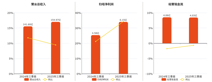 公司营业总收入为154.97亿元。归母净利润为6.15亿元。经营活动现金净流入为4.03亿元,较去年同报告期经营活动现金净流入减少276.14万元,同比较去年同期下降0.68%。