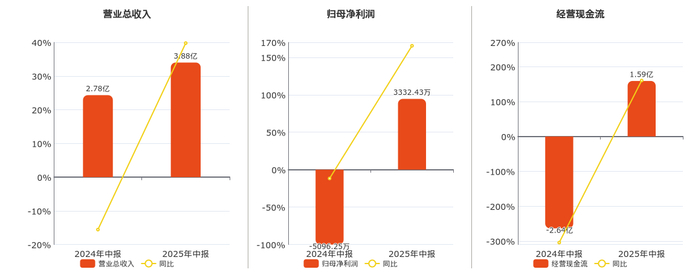 公司营业总收入为3.88亿元,较去年同报告期营业总收入增加1.10亿元,同比较去年同期上涨39.77%。归母净利润为3332.43万元,较去年同报告期归母净利润增加8428.68万元。经营活动现金净流入为1.59亿元,较去年同报告期经营活动现金净流入增加4.23亿元。