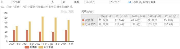 据东方财富网数据,普路通总经理倪伟雄2024年所获薪酬为73.75万元,相较上年薪酬61.07万元涨薪20.76%。