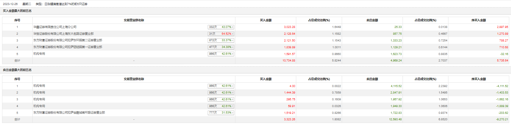 12月26日,真视通今日涨停,全天换手率达36.74%,振幅达12.57%。龙虎榜数据显示,营业部席位合计净卖出3534.58万元。其中,机构买入3395.62万元,卖出1.25亿元,合计净卖出9098.75万元。此外,华鑫证券上海分公司、华宝证券上海东大名路证券营业部分别买入3023.28万元、2128.64万元;东方财富证券拉萨金融城南环路证券营业部、东方财富证券拉萨东环路第二证券营业部分别卖出1722.83万元、1333.23万元。