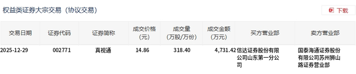 12月29日,真视通大宗交易成交318.4万股,成交额4731.42万元,占当日总成交额的47.07%,成交价14.86元,较市场收盘价15.16元折价1.98%。