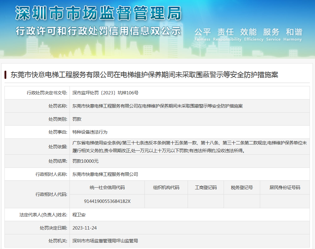 东莞市快意电梯工程服务有限公司在电梯维护保养期间未采取围蔽警示等安全防护措施案