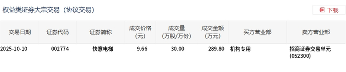 快意电梯今日大宗交易平价成交30万股,成交额289.8万元