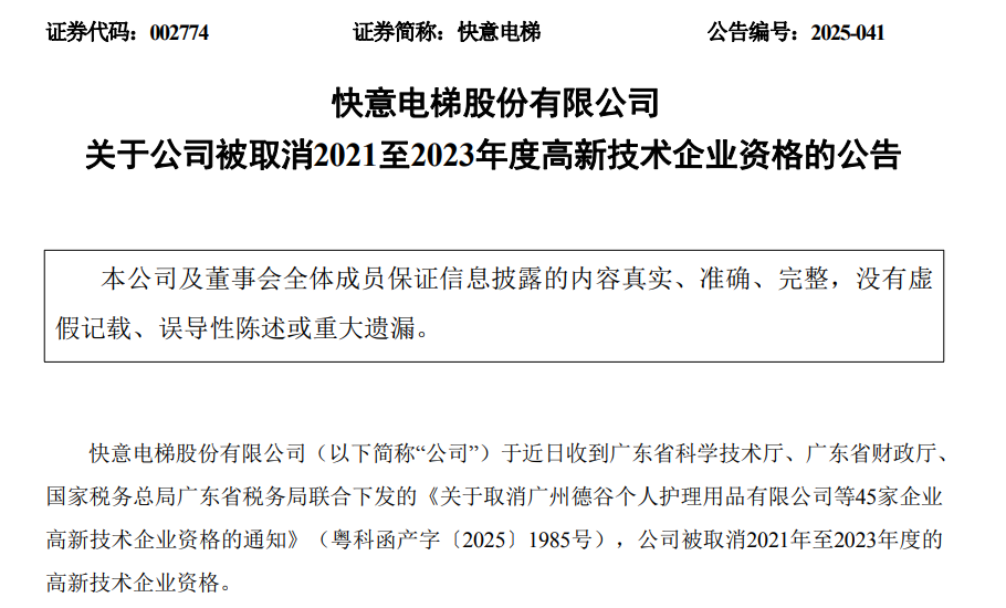 12月3日晚间,快意电梯(002774)公告,公司近日收到广东省科学技术厅、广东省财政厅、国家税务总局广东省税务局联合下发的通知,公司被取消2021年至2023年度的高新技术企业资格。